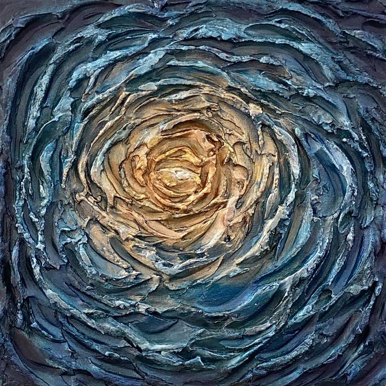 "Celestial vortex" is a work that immerses the observer in a sensory experience that is both visual and tactile. This 20x20 cm painting, framed by a golden edge. The relief of the composition accentuates the depth and dynamism of the work, inviting the eye to follow the fluid movement of the petals ...