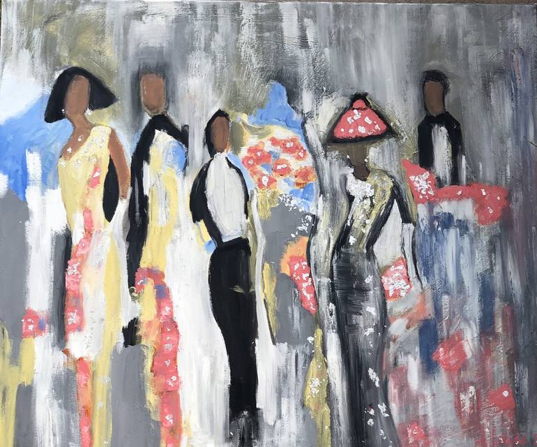 Original oil painting on canvas “Ceremony “. Pastel colors:light blu,light yelow,grey,white. Beautiful peoples. Beautiful ceremony. The sides are painted.