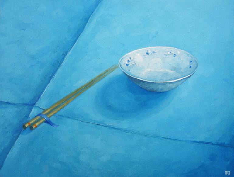 Oil on linen hardboard panel Varnished piece This painting depicts an oriental table with a pottery setting against a cerulean blue background. Executed with a palette knife technique, the work features rich, expressive textures across the table and objects, enhancing their presence and highlightin...