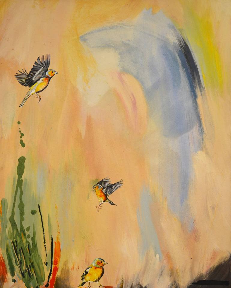 One of my bird paintings, mixing abstract backgrouns with figurative elements in the birds.