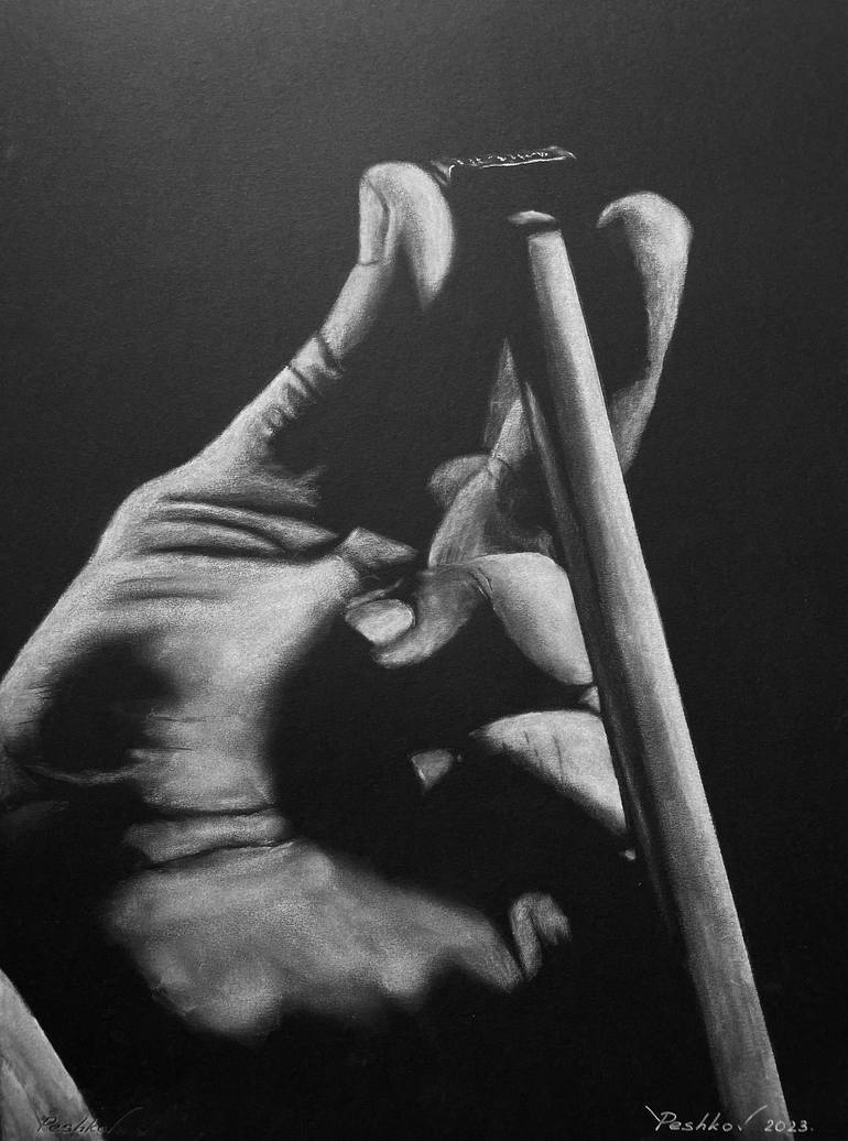 Hand chalking cue. Painting made on black paper by white pigment. Technique: Dry brush.