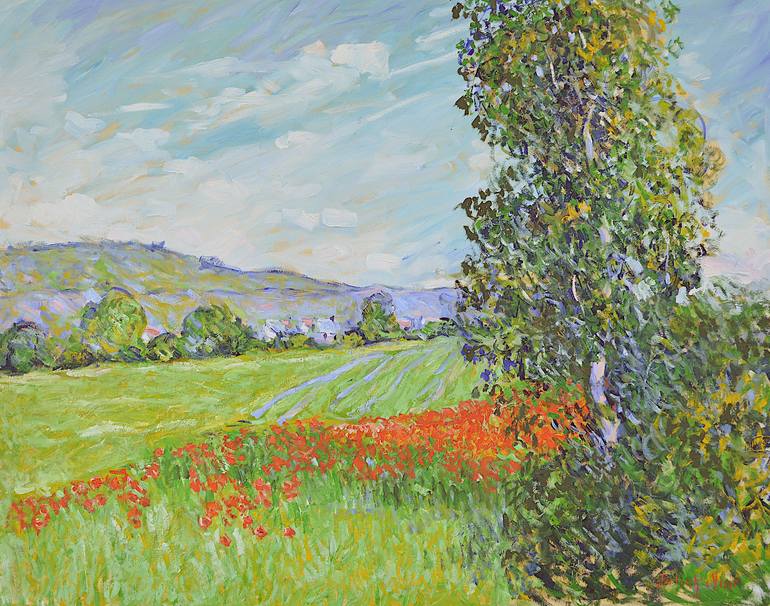 Au mois de juin , les coquelicots parsèment les champs de leur couleur rouge vif en contraste avec le vert tendre des champs de blé. Tableau réalisé de mémoire dans une campagne voisine de mon atelier. ...