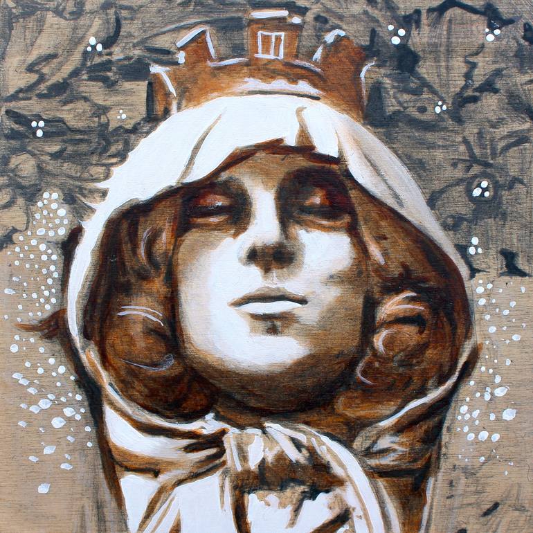 When painting, headdresses and crowns deify Kate Kelton’s subjects. She uplifts the Unsung Sheroes & Heroes, Patriarchy Smashers, Warrior Survivors, Silence Breakers, Philosophers, Truth-Tellers, Whistle Blowers and Thought Giants of all stripes. She paints her portraits cloaked in the garb of statues Ladislav Šaloun sculpted onto the train station that her great-grandfather, Josef Fanta, designed for Prague in 1901 - 1909. Apotheosis through a reclaimed, reapplied Art Nouveau. Sampling her own lineage, she transforms a historical body of work, itself a thing of lasting beauty; exchanging granite for graphite, plaster for paint. In Photoshop, she first combines the desaturated faces she's found, sourced or shot of her chosen subjects, with the black and white photos from her family and friends, of the statues in situ. Then she uses graphite, inks and acrylic paints and glazes to create the works on panel or canvas, literally uplifting and elevating her battle-weary subjects to the highest reach of architectural strata. 'Ancient and distant godlike beings, surveying a dying empire, trade places with the fresh blood of her subjects. The work presents a tactility against the digitized space, and represents a taking, an acquisition of power back from the tastemakers. Here, the mantle of the artist is above brand influencer, above internet commentator, above mere marketability. In their gaze is a warning, “Art is immortal. Come for me, why don’t you?”' ~ Micah Chaim Thomas "Kate's recent work is a matter of expansion through contrast - she is as ephemeral as her subjects are concrete architecture; she is structural when her subjects should slip through your fingers like too-fine sand. Taken as a whole, the works in her magnificent series Sentry are incredibly intelligent, but when looked at individually, you come to understand that these are statements of life beyond themselves. The series take embellishments of a Prague train station designed by her great-grandfather, Josef Fanta, and combines these with portraits of women who have stood against the sexual harassment and assault rampant in Hollywood. These women, like Kate herself, have suffered in the era where powerful men, every bit as immovable as the train station, wielded their power without check. The portraits emblazoned on architectural elements, they are marked against the edifice, every bit as permanent, and perhaps even more defining.