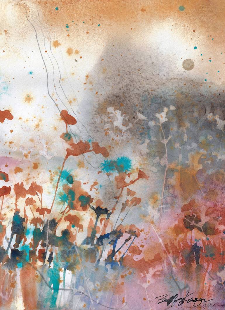 Capturing the California wild, which is covered in chaparral that stretches from Southern Oregon to Baja Mexico. Paper was prepped with floating inks, creating bands of charcoal wisps. Chaparral painted in ultramarine, sienna, magenta, sepia and cobalt teals. The grasses and crowns painted directl...