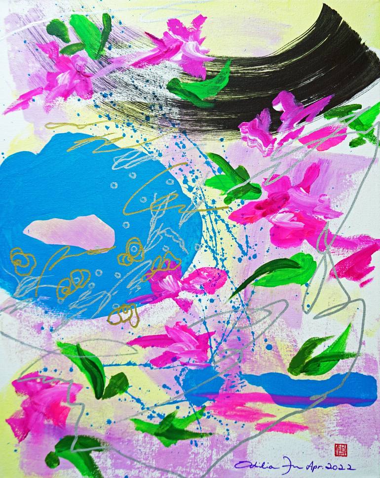 Acrylic, Markers on Stretched Canvas Protected with Professional Varnish Unframed "Hope & Recovery" series is created during the time of pandemics and political unrest under the theme of "Music in Ink". It is inspired by blooming flowers in my urban neighborhood, poetry and music which evokes sha...
