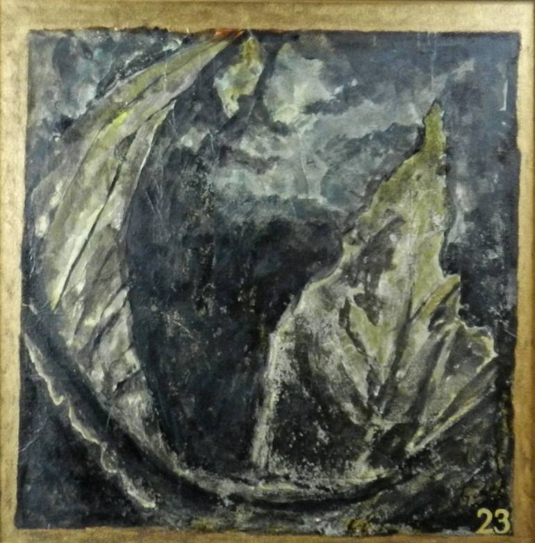 A single cherry leaf is a landscape in itself. The superimpositions of Japanese papers, worked in Indian ink and enhanced with golden color, give the whole a dramatic vibrancy and intensity.