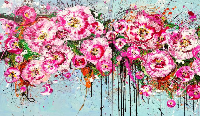 Shown at the Swiss Art Expo 2022, Zurich, Switzerland Cherry Pop, oil, acrylic and enamel on canvas, 200 x 120 x 2 cm on two canvases each measuring 100 x 120 x 2 cm (Diptych) Cherry Pop, a spring explosion. Colour abounds and life awakens. A celebration in pink, a carnival of life. Cherry Pop. Crea...