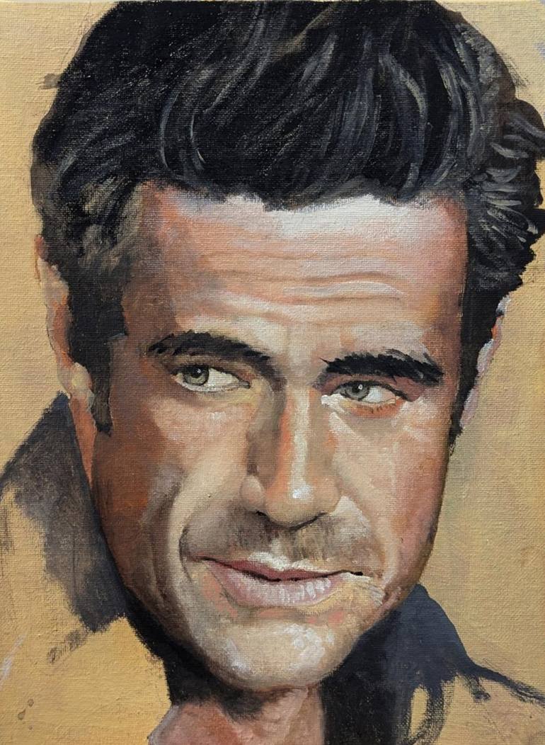 A contemporary portrait style rendering of a man against an ochre background. Featuring an expressive pose, strong lighting and a neutral palette.