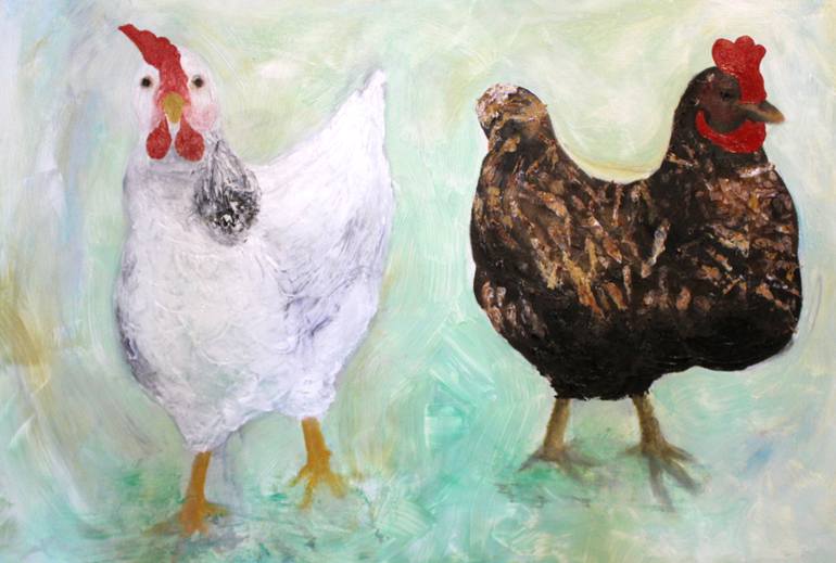 After mixing my paint with a heavy body gel medium, I used many different brushes and a pallet knife to create this texture filled painting of two beautiful chickens. This painting should make its viewers feel calm, relaxed, and filled with joy.