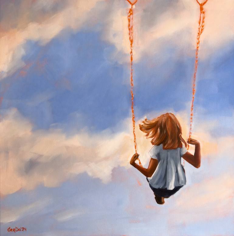 Title: Childhood The work is painted with oil paints on a stretched canvas. The borders are painted in the color of the picture. Size: 60 x 60 cm. Materials: stretched canvas, oil paints, brush. Small Girl on Swing Cloud Sky Painting