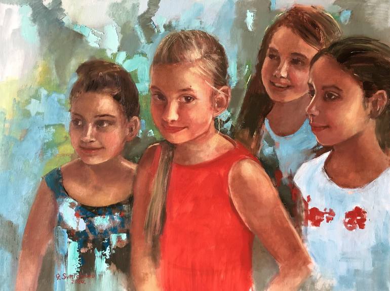 I was inspired to paint this painting by these cute girls from Tuscany. Three girls look at the fun birthday performance with interest, and the girl in the center looks intently right at us. The background of the painting is not detailed, but is designed in the form of an abstract landscape. I use t...