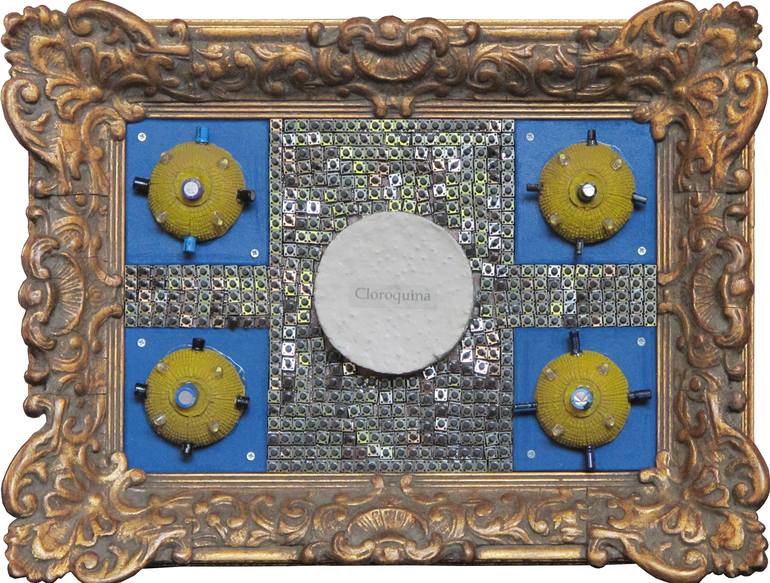 Technique: Oil + mini buttons + transistors on semi-spheres of handmade paper made by the artist, wood and golden frame. Dimensions: 27 cm X 18 cm Year: 2020 In the center of the frame, there is a cylinder made of handmade paper that represents a chloroquine tablet. Several mini electronic buttons ...