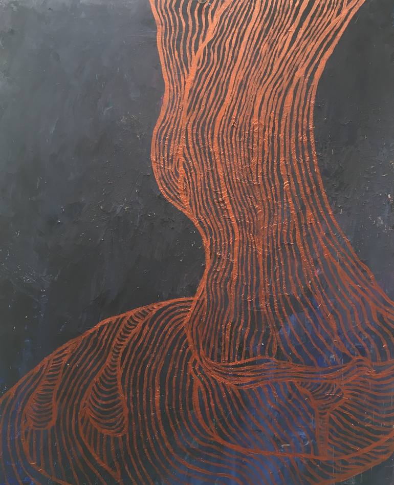 This painting is a linear representation of melted chocolate pouring down like a waterfall. I made the chocolate form partially transparent so that the deep background colour could be well incorporated into the metallic bronze hue. I find that allowing a usually solid form to become linear and trans...