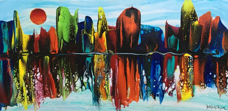 I am always up for trying new things and materials, so in this piece, I practiced and experimented so I would be able to manipulate the fluid acrylic paint to create a city. Pouring medium and silicone were added to the paint to help the creation.