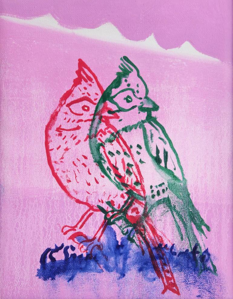 Small vertical ornately framed oil painting of the same bird painted twice in red and green on pink. The words Church and State suggest a branch or nest while referring to the blurred boundaries between institutional power and influence. framed dimension 10.5x12.5 inches