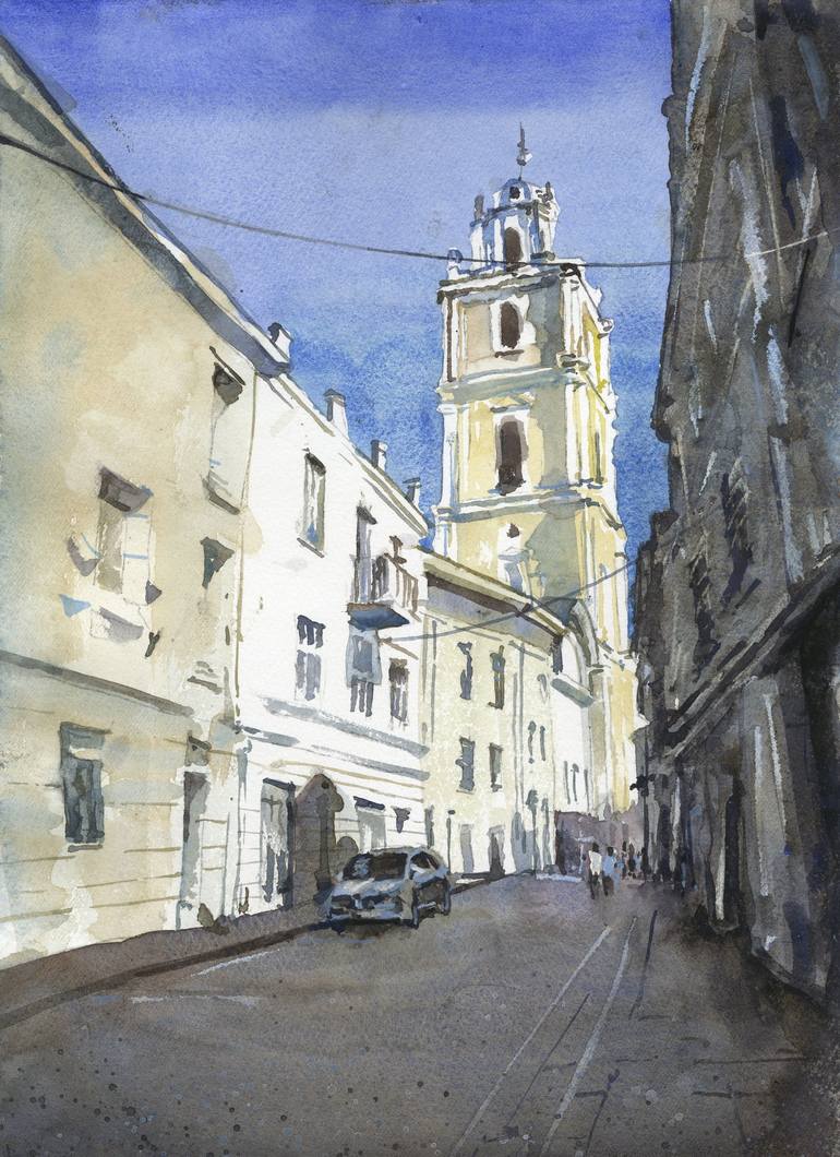 Church bell tower in Old Town Vilnius Lithuania travel essentials art for home cityscape architecture 11x15" watercolor on 140 lb professional watercolor paper. Hand signed by artist. Unframed. Painted by artist Ryan Fox. Ryan Fox is a signature member of the American Watercolor Society as well ...
