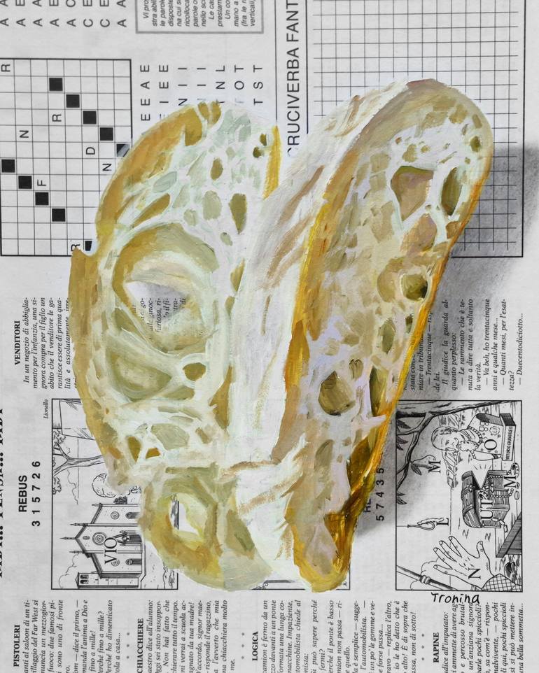 Two slices of Italian ciabatta bread, original art on newspaper, bread painting. -Title: Ciabatta -Picture size: 24x30 cm / 7,1x11,8" -Materials: oil, newspaper, cardboard, UV protection -The picture is unframed -Shipment: securely packed in a cardboard box Paintings on newspaper should not be exp...