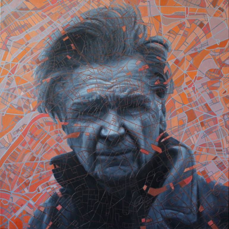 I imagined the portrait of Emil Cioran, one of my favorite authors, starting from an old photograph of him. I intended to capture his expression of indulgent disappointment towards the world. The background is a map of Paris, the city that he loved enormously and that he walked through on nights of ...