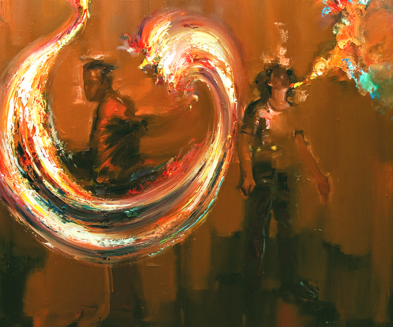 Two figures broken up by pictorial matter are the protagonists of the painting. The dynamism, also given by a strong pictorial gesturality, introduces the observer to the two jugglers who are entirely masters of their circus skills.
