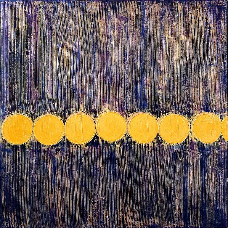 Abstract painting of a bead strand made of citrine stones. The sunny yellow circles contrast nicely against a rich textured background done in blue, purple and gold. Part of the Amulet series, which is about healing crystals, jewelry and energy. Citrine is the happy stone. It has the ability to con...
