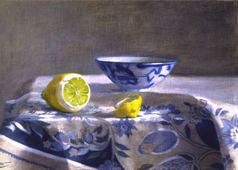 " Citron et Porcelaine ' est le tableau emblématique d'un cycle consacré à la nature morte et aux recherches dédiées à la redécouverte des techniques des maitres de la peinture à l'huile.