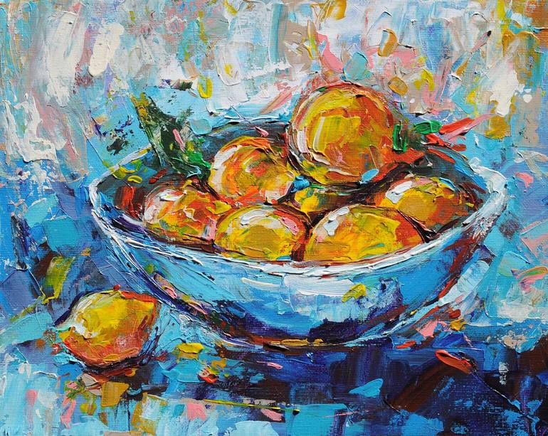 Experience the zest of life with "Citrus Still Life," a captivating painting that reimagines the beauty of citrus fruits through abstract expressionism. Bold acrylic strokes move across the canvas, creating a vibrant interplay of blues and yellows that captures pure energy. This artwork is more than...