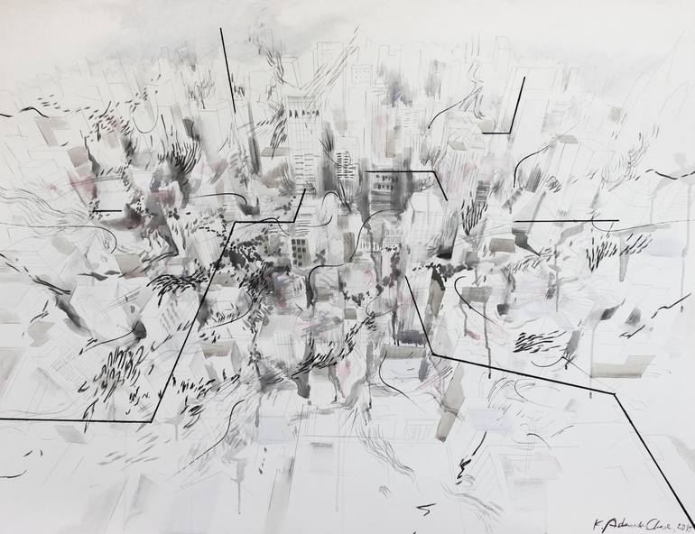 The picture is based on two styles of expression - first is a subtle architectural drawing of a city, and the second is abstract emotional composition of spots, lines and structures.