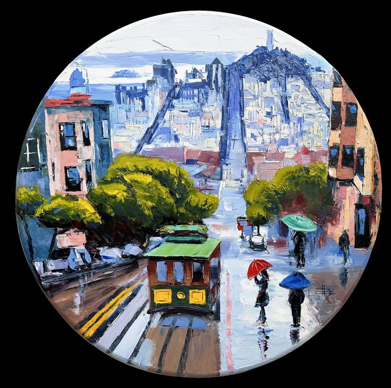 The streets of San Francisco Bay come alive with this urban scene featuring an iconic cable car and figurative details, with the city in the background against the backdrop of the San Francisco Bay. This is an original oil painting on canvas, showcasing Lisa's distinctive deep impasto style. The bo...