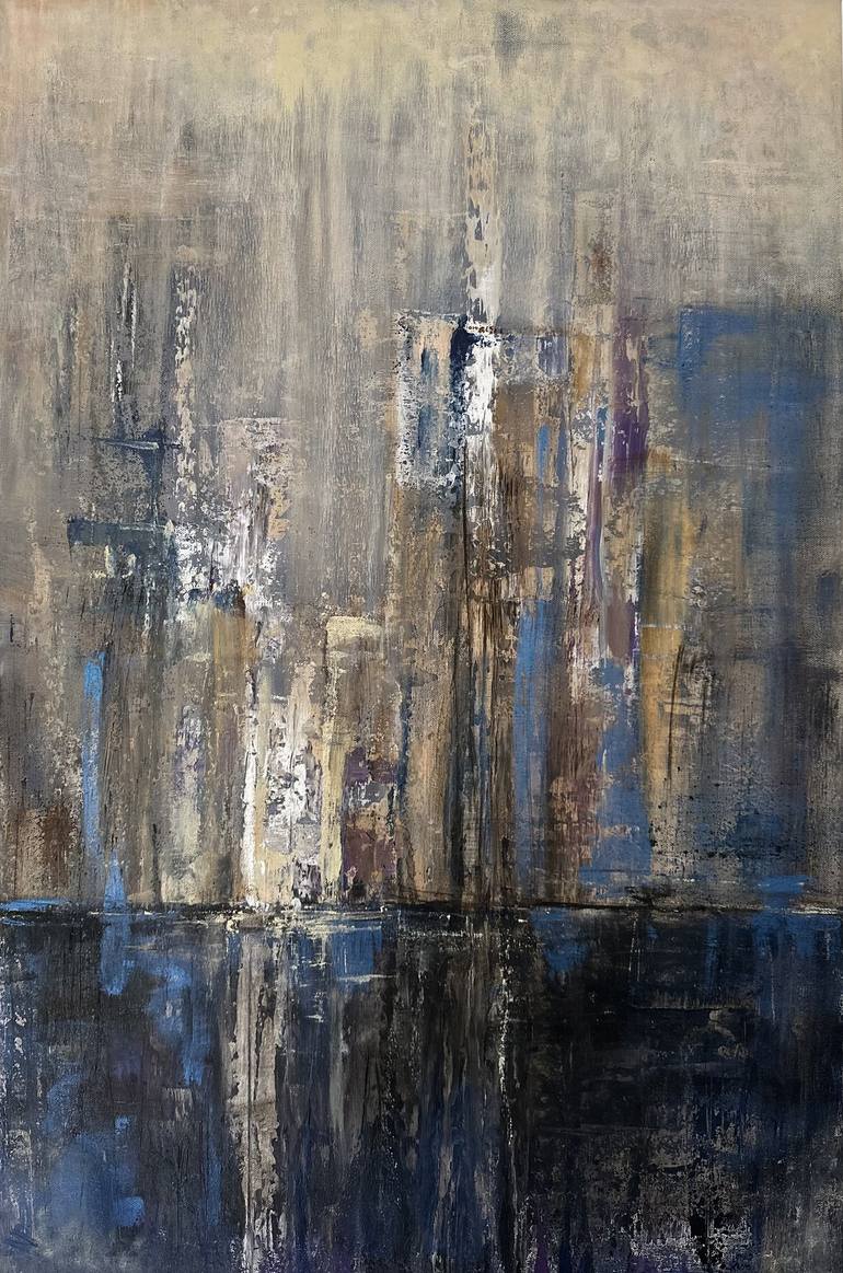 This painting is an abstraction of a big city in blue-silver mother-of-pearl, seemingly depicting a big city in a misty evening. Ask your questions and I will be happy to answer them
