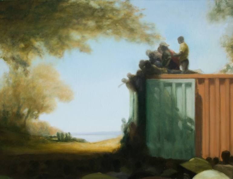 This painting of mine is part of a series in which I’m dealing with the tension of illusion and reality. I grab „interesting” images of currant events from TV news feature, and I manipulate them like the mass media itself. I put currant events in a timeless dimension and make them weightless combini...