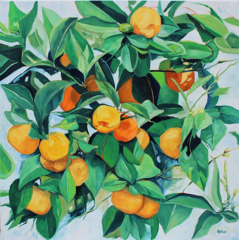Clementine tree. I embraced a blue hue while working the leaves this time. Oil on canvas, ready to hang.