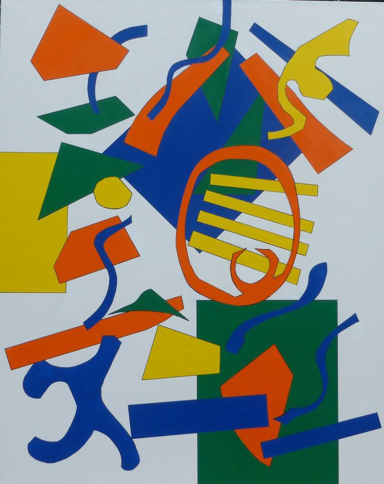 This painting was inspired by a training session I gave on abstract non-objective painting. Using color paper-cutouts as per say Matisse had done. The forms lined up like a David Smith sculpture called "Australia" that had some influence on me as he to used cutouts to layout a sculpture idea. This p...