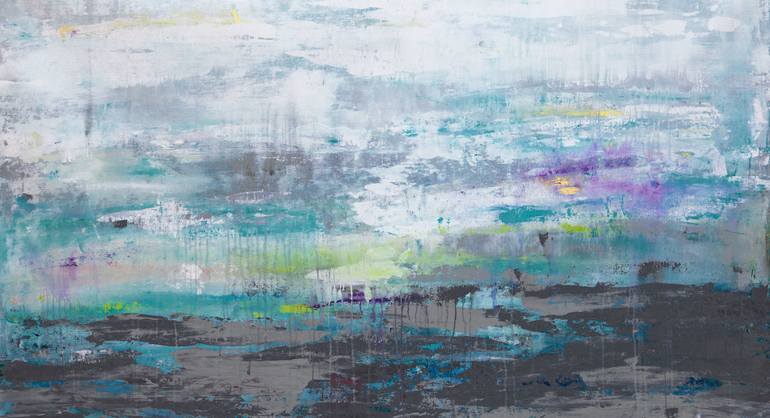 Cloudline is an original painting, created with acrylic paint on an unstretched canvas. It has a width of 71 inches and a height of 40 inches (40x71 inches). The colors used in the painting are yellow, teal, white, blue, lime green, purple, gray and silver, with a small amount of red. An archival,...