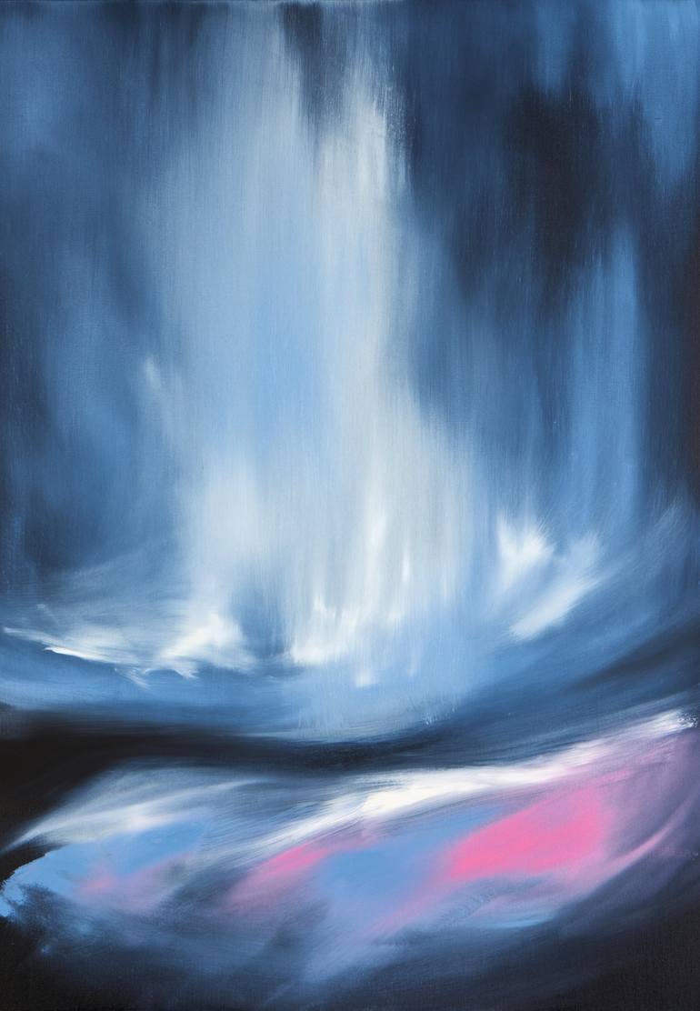 This ethereal oil on canvas painting captures the intense energy of a stormy British landscape. As a piece of contemporary abstract artwork, it features expressive brush strokes that convey the raw power and dynamic movement of the scene. The viewer is invited to feel the charged emotions and vibran...
