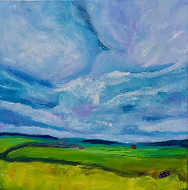 This painting of a cloudy sky is painted in oil on a 30 x 30 inch canvas. The subtle blend of greys and blues create a peaceful atmosphere and a feeling of an overcast day. The painting includes a hint of land in the distance, adding a sense of depth and perspective. This artwork would be an ideal a...