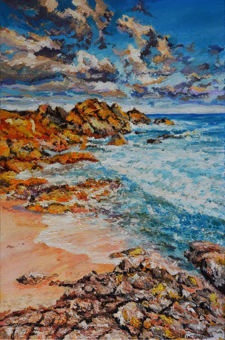 This painting captures ,,Coast,, a seascape with strongly accentuated brush strokes and beautiful colors that give a special atmosphere of the sea coast. It is signed on the front and comes with a Certificate of Authenticity.