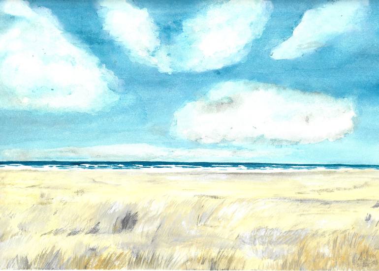 This watercolor captures the quiet elegance of a windswept coastal scene. Gentle waves roll against the shoreline beneath a vast sky dotted with dramatic, rolling clouds. The foreground is painted in soft, golden tones that suggest wild dune grass or dry beach sand stretching all the way to the hori...