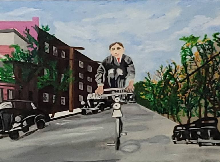 "Coasting" is a captivating 40x30 inch acrylic on canvas painting from 2020. It portrays a scene inspired by an old photograph, featuring a young boy coasting down a street on his bicycle. The backdrop includes classic cars and a charming mix of urban and natural elements, creating a nostalgic atmos...