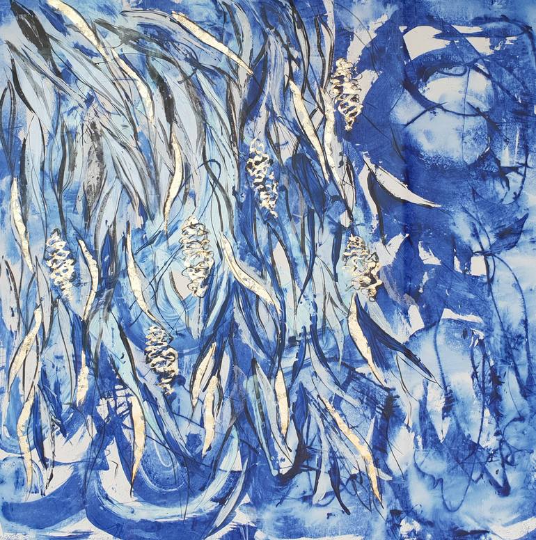 This vibrant artwork depicting the Banksia seed pods and trees in an abstract, monochrome palette. This artwork is painted in a rich cobalt blue paint, white and soft pale blue pearlised paint and a soft green/blue aqua pearlised paint . There is a soft shimmer in the pearlised paint with works beau...