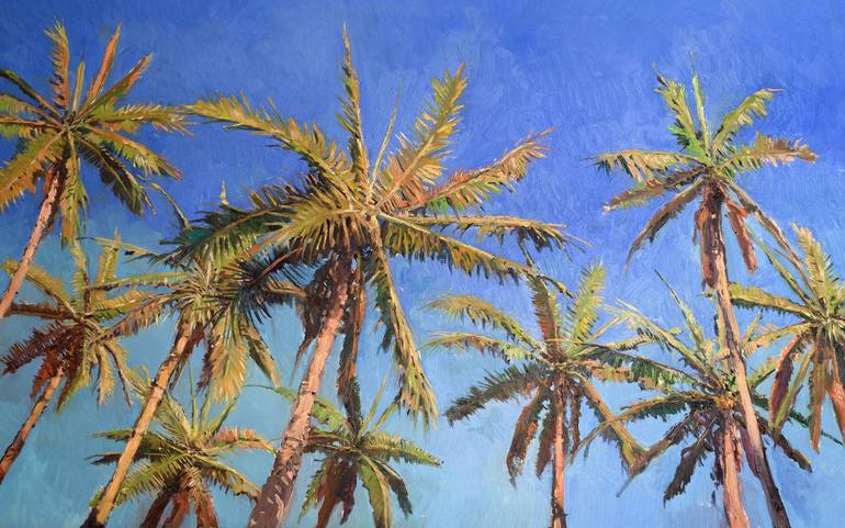 The elegant shapes of coconut palm trees on the blue sky reflect the Tropical Vibe from the beach. Warm green-orange shades and bright blues of the sky together look full of life and create a dynamic motion. The artwork is on gallery-wrapped, oil-primed canvas. it has a wire from behind to be displa...