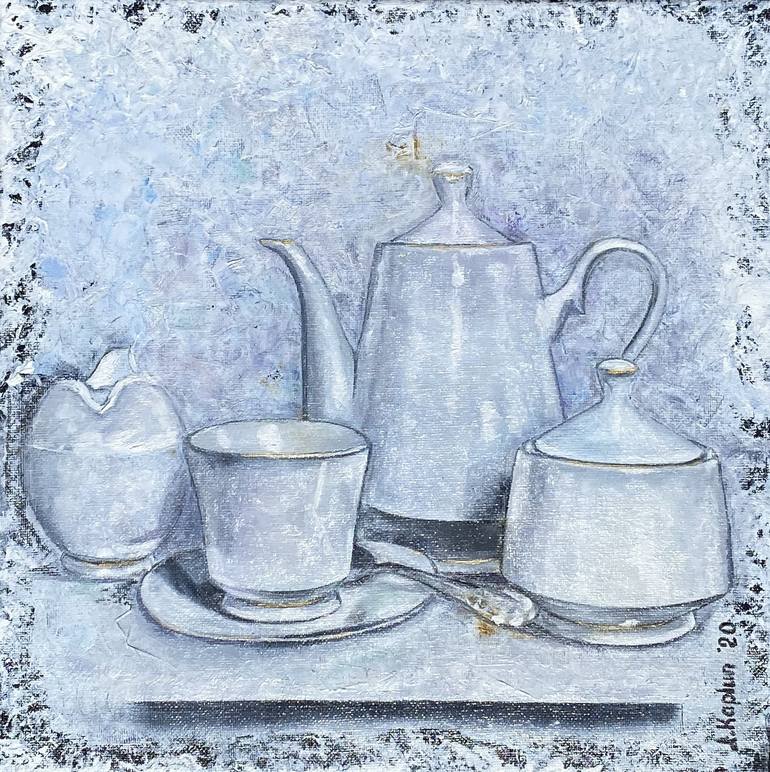 Coffee utensils, tableware, crockery, white still life, painting, coffee pot, cup milk, jug, sugar bowl. Original Oil Painting on stretched canvas. Still life for kitchen, dining, hallway, family room. White color tea utensils for one person coffee drinking. Why only for one? Signed and dated. S...