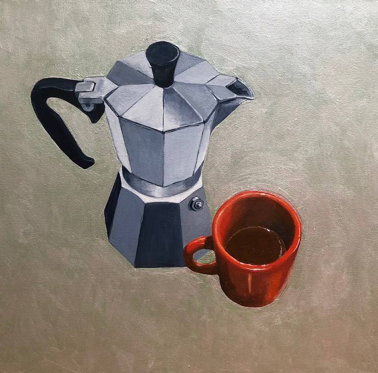 I made this picture after having realized my apartment was full of good things to paint. In particular metal objects.The moka and espresso cup get used everyday and I think capture the light in an interesting way. The silver background was an experiment that I think keynotes the dramatic lighting.
