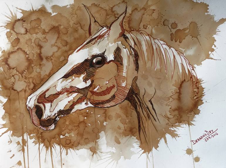 Spilled coffee and then I sketched with ink pen and some brush touch. Horse represent power - this will add a powerful statement to any room or executive office. The painting is done on acid free Cold pressed 100% Fabriano Paper - 300 gsm and will be send tube-packed.