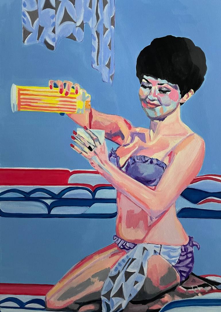 A lady who evokes the old 70s, the mattress and the water bottle, all stand out in today's environment.