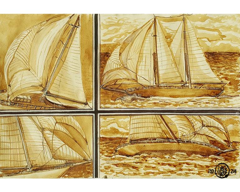 The painting is called "Sails in the Wind" with the image of sailing yachts. It is related to my past profession as a yacht designer. Painted in the original author's technique with the help of coffee and watercolor, on watercolor paper To each author’s picture and a copy of the picture The authen...