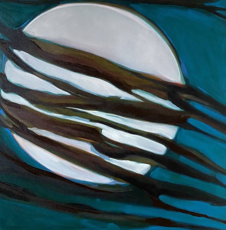 My Moon Muse paintings strive to capture the Magic of Mother Nature. An abstract, oil stained, square canvas evoking a memory of Winter walks glimpsing the full moon as she plays peek-a-boo through the forests entwined branches. Reminding me that everything is connected.