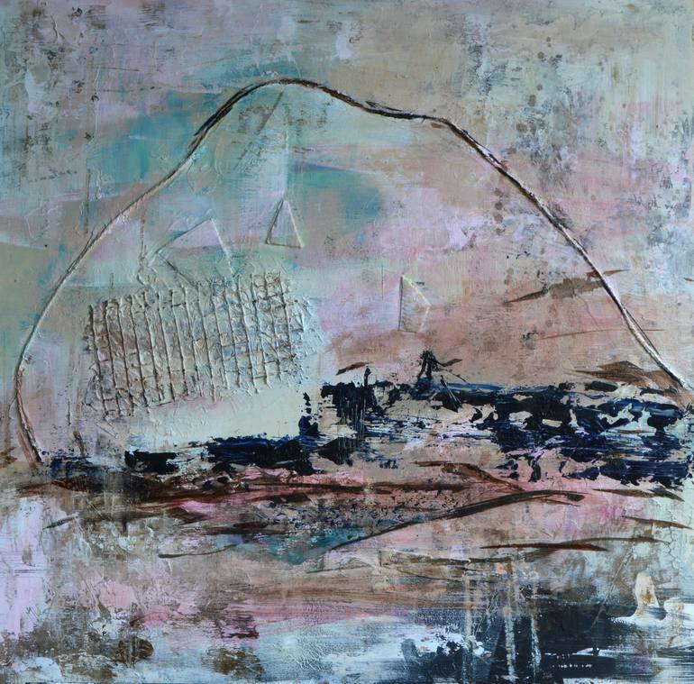 Abstract acrylic and ink on plywood. Mixed media, I used garden net, cardboard, thread and modelling paste. Size W60 H60 D 0.5cm Unframed.