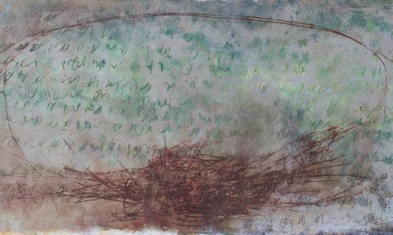 Highly textured painting, illegible script and twig-like lines weave together in a nestlike fashion. It's a warm and intimate painting in rich brown and subtle blues. Artist made frame of thin pine, finished with a natural wax.
