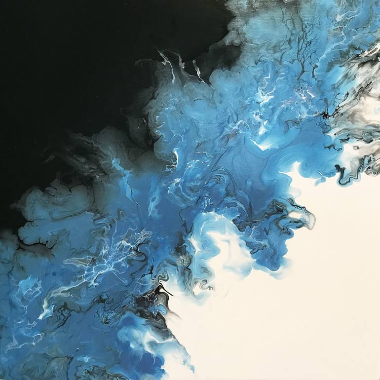 Abstract Hand Painted Acrylic Pour Painting "Color Fusion No. 14" in blue, eggshell, and black ideal for home and office. - Title: "Color Fusion No. 14" - Size: 12" H x 12" W - Hand signed by artist on bottom edge - 1½” thick gallery wood frame - Seamless color blending over four ...