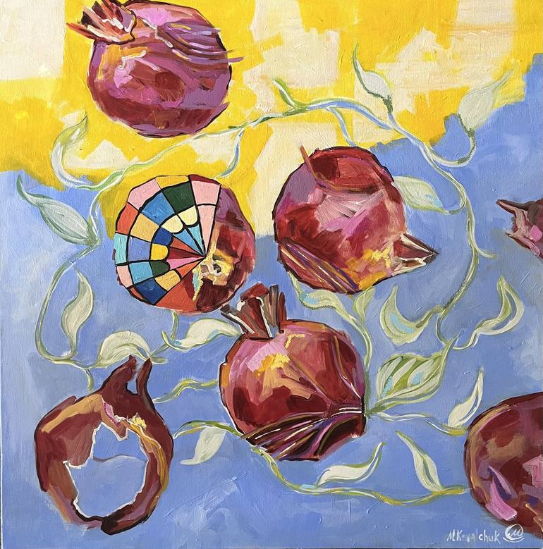 Color of pomegranate. 2025 Acrylic and pastel on canvas. Ready to hang. The pomegranate as a symbol carries deep meaning, associated with life, fertility, renewal, and spiritual unity. This image resonates particularly strongly in the context of Ukrainian culture, as the symbolism of fruits has oft...